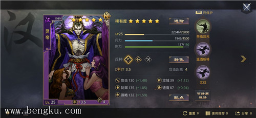 首先位于大营的灵帝是每个玩家都可以获得的一个五星强力武将,获得的条件就是登录游戏三十天。同sp司马懿不一样,对于平民玩家来说,灵帝真的算是自己的核心武将了。灵帝的谋略值和攻击值相差不多,所以灵帝的玩儿法有很多种,可以选择纯攻,纯法或者法攻双修,没种发展方向都是不错的,但是这里推荐大家选择法攻双修的灵帝,主要原因在于灵帝的主技能帝灵回光。在第三回合后灵帝进入分兵状态,普攻攻击后对目标周围人造成额外伤害同时会附加恐慌效果,造成策略伤害,同时这是指挥战法,所以灵帝的输出就非常稳定了。这两种伤害都非常可观,放弃任何一个都略微可惜,选择法攻双修就比较完美了。附加战法建议选择文伐加温酒斩将,这两个都是追击战法,前者是造成策略攻击,后者则是物理攻击,正好对方双修的目的,而且这两个四星战法也并不难获得。