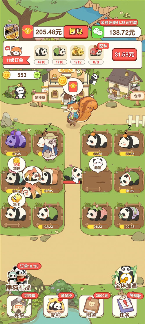 养熊猫的小游戏,小游戏没有那么复杂,在土地上面的养殖熊猫,完成订单给红包,不过小游戏想要完成订单的快一点,那么需要解锁所有的土地,不过也许看广告!小额还给,大额度就不要想了哈!